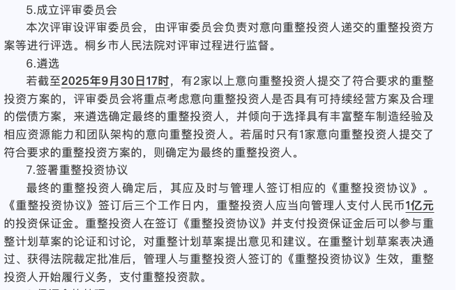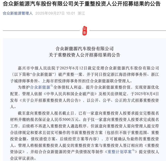 9月27日,合众新能源(哪吒汽车母公司)管理人通过微信公众号披露合众新能源重整投资人公开招募结果称,截至意向重整投资人报名截止日,已有一家意向重整投资人按要求提交完整报名材料并缴纳报名保证金5000万元
