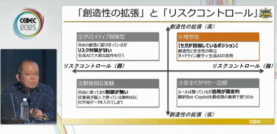 曾在2025年7月22日的CEDEC 2025上,日本游戏公司SEGA就曾举办了一次“安全可靠地使用生成式AI!介绍公司内部目前使用的生成式AI治理”的研讨会,介绍了SEGA公司是如何运用AI的。